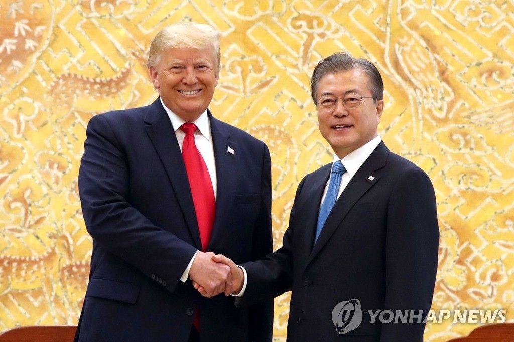 6月30日,在青瓦台,韩国总统文在寅(右)与美国总统特朗普握手合影。 韩联社