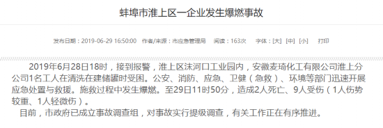 荔枝新闻讯 据蚌埠市应急管理局官网消息,6月28日18时,接到报警,淮上区沫河口工业园内,安徽麦琦化工有限公司淮上分公司1名工人在清洗在建储罐时受困。公安、消防、应急、卫健(急救)、环境等部门迅速开展应急处置与救援。施救过程中发生爆燃。至29日11时50分,造成2人死亡、9人受伤(1人伤势较重、1人轻微伤)。