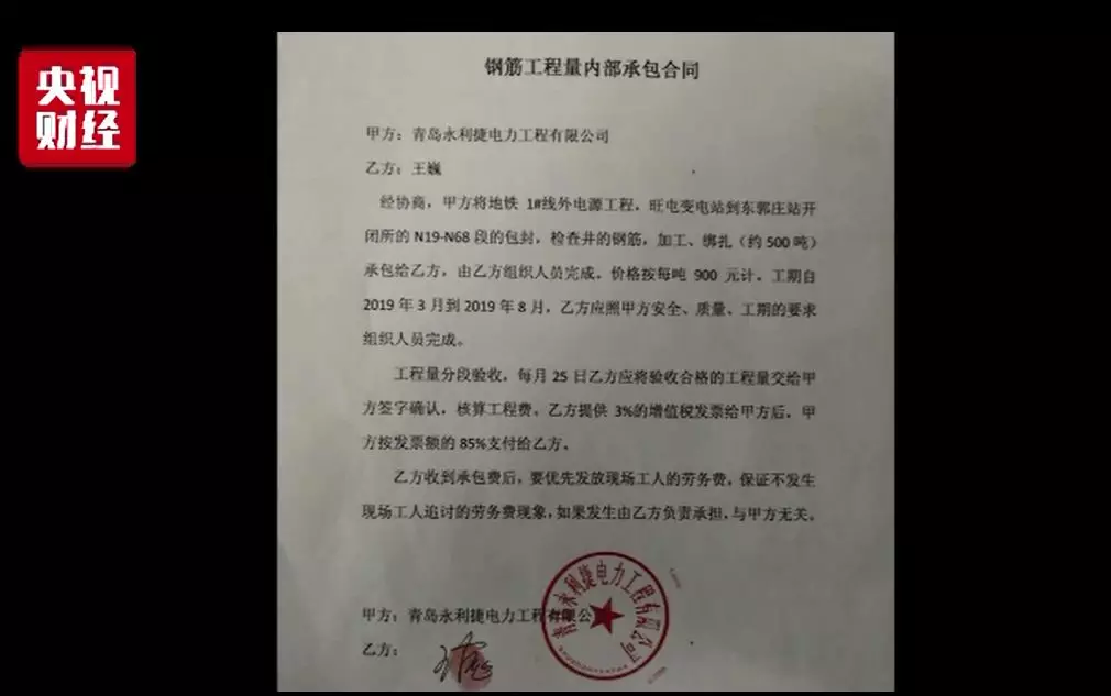 6月29日,央视财经报道了青岛地铁施工方自爆偷工减料的新闻。爆料人透露,与他签订合同的上级公司其实就是一个皮包公司。
