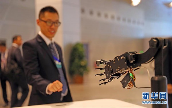 7月1日,在大连国际会议中心,参会嘉宾体验“猜拳”机器人。