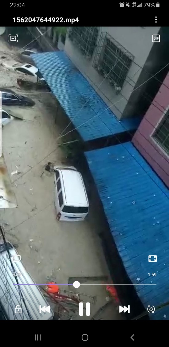 6月30日下午,这段视频的拍摄者杨卓(化名)向红星新闻回忆,6月22日早上6点,住在4楼的他醒来时,发现外面在下雨。9点左右,他在手机上接到当地气象台发布暴雨黄色预警的消息,向窗外张望,看到洪水从远处斜坡上滚滚而来,几辆汽车也被冲到楼下,“几十年没见路上涨这么大水了”。