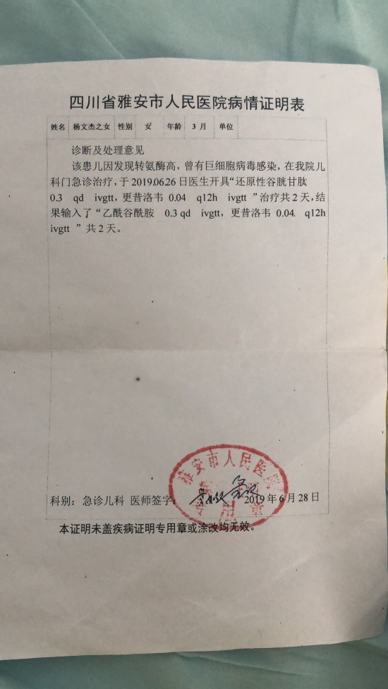 新京报记者在雅安市人民医院出具的病情证明表中看到,杨文杰之女因发现转氨酶高,曾有巨细胞病毒感染,在该院儿科门急诊治疗,于6月26日医生开具还原性谷胱甘肽0.3g及其他药物治疗共两天,结果输入了乙酰谷酰胺0.3g及其他药物共两天。表后盖有雅安市人民医院公章。