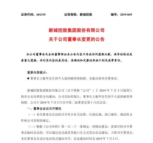 新城控股集团股份有限公司(以下简称“公司”)于 2019 年 7 月 3 日接到上海市公安局普陀分局通知,公司实际控制人、董事长王振华先生因个人原因被刑事拘留,公司于 2019 年 7 月 3 日召开第二届董事会第十六次会议。