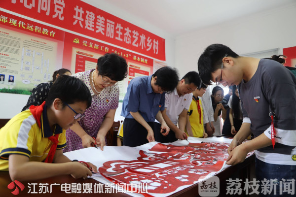 南林大艺术学院师生和顾陇社区党总支的党员与国际慢城小学的师生通过学校非遗特色教学剪纸活动,共同完成一幅“不忘初心,牢记使命”的主题剪纸。