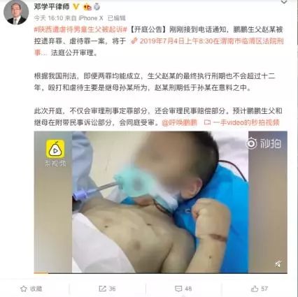 备受关注的陕西渭南“继母虐童案”受害儿童鹏鹏(化名)生父即将于明日(7月4日)受审,根据起诉书,其涉嫌虐待罪、遗弃罪。
