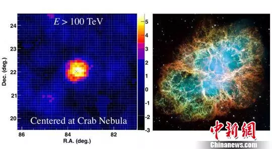 左图:西藏ASgamma实验观测到蟹状星云方向100TeV以上的伽玛射线;右图:美国哈勃望远镜观测的蟹状星云图片(图片来自于NASA)。中科院高能所