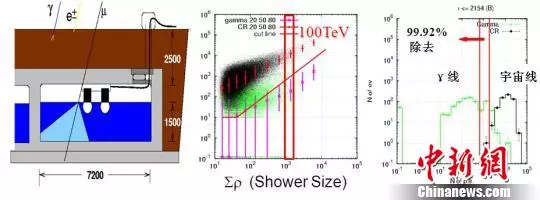 左图:西藏羊八井ASgamma实验组利用地下缪子探测器;中图和右图:由于伽玛光子产生的缪子数量远远少于质子和重原子核与空气作用所产生的缪子数量,因此可根据地下缪子探测器探测到的某个事例产生的缪子数量来甄别该事例是伽玛光子事例还是非伽玛光子事例。中科院高能所