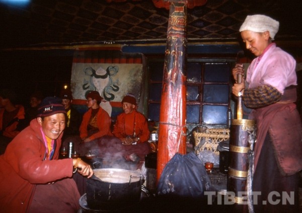 罗布是小昭寺内专管送茶等杂务的僧人,他通常每天要给大家送三次茶,分别在早中晚的诵经礼佛活动之后。如果遇到法会、跳神期间,那供茶次数就不定了。他说他们平时在学习、诵经 、辨经、静修时也要不断地喝茶,如果不喝就会哈欠连天、困倦不已、头脑中一片混沌……