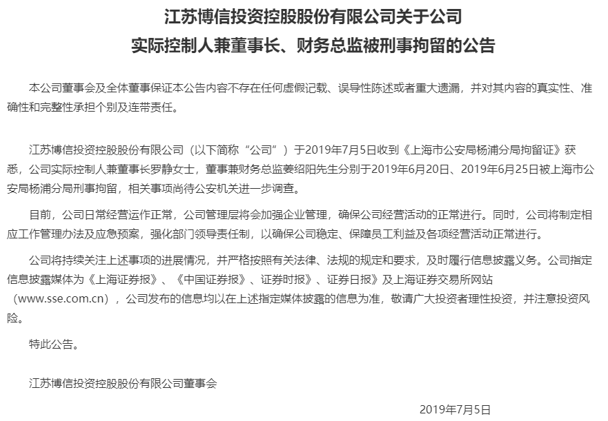 7月5日午间,博信股份公告称,江苏博信投资控股股份有限公司于2019年7月5日收到《上海市公安局杨浦分局拘留证》获悉,公司实际控制人兼董事长罗静女士,董事兼财务总监姜绍阳先生分别于2019年6月20日、2019年6月25日被上海市公安局杨浦分局刑事拘留,相关事项尚待公安机关进一步调查。