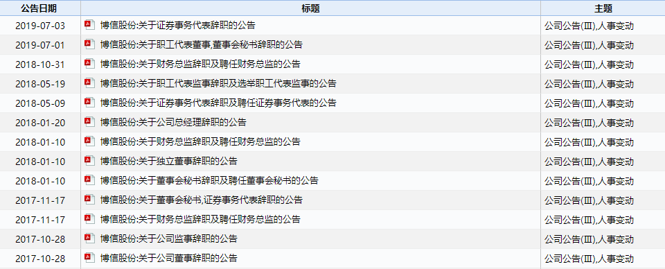 在梳理博信股份公告时,记者还发现了一个有意思的现象,从2017年至今,博信股份管理层变更频繁,尤其是董事会秘书的职位。