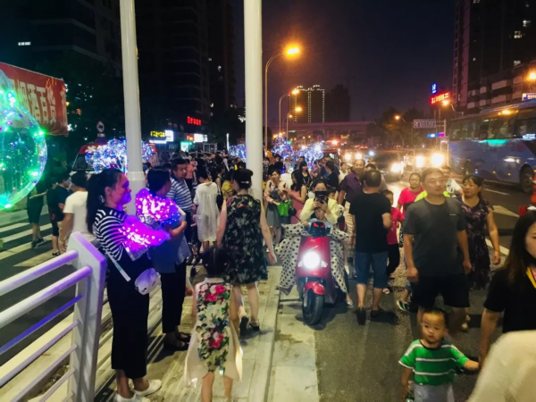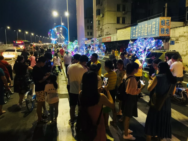 7月2日晚8时许,记者由北向南沿淮海南路来到淮安运河大桥边。行至新都汇超市门口时,人就明显多起来。至大桥北引桥的起始点,清安路与淮海南路交叉口处,只见斑马线两端都有不少正在贩卖闪光气球、闪光头饰的流动摊点,有的摊点还延伸到了大桥人行道上。本来交叉路口车流、人流就多,加之不少市民驻足购买气球等物品,或者停在路上给大桥拍照,现场机动车、非机动车、行人交织,有些拥堵。