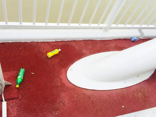 当天上午记者在桥面上的观察也印证了环卫工人的话。虽然早晨桥面已经过打扫,但仍留下了一些前一夜“狂欢”的痕迹。记者沿大桥两侧人行道来回走了一圈,发现沿途栏杆脚下仍然留有一些烟头。卫生“重灾区”则是主桥人行道两侧为安置主塔悬索和灯光设备的红色隔离带。这里集中了最多的垃圾,除了烟头,还有饮料瓶、废纸屑、烧烤棒、冰淇淋纸壳……环卫工人告诉记者,由于这里不属于主桥面,而且清扫需要翻越栏杆,危险程度高,他们几乎无法打扫。
