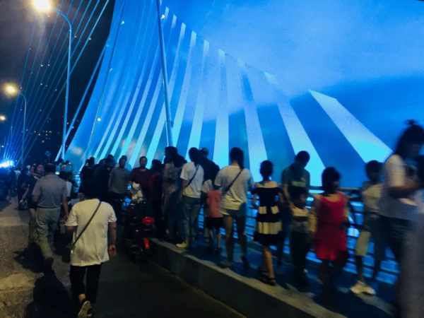 在7月2日晚间的采访中,记者亲眼所见的,就有一位老大爷不顾危险,走到新都汇超市门前机动车道的中分带上举着手机拍摄大桥照片。而在大桥主塔下,一位女士攀上栏杆,请朋友为其拍照。