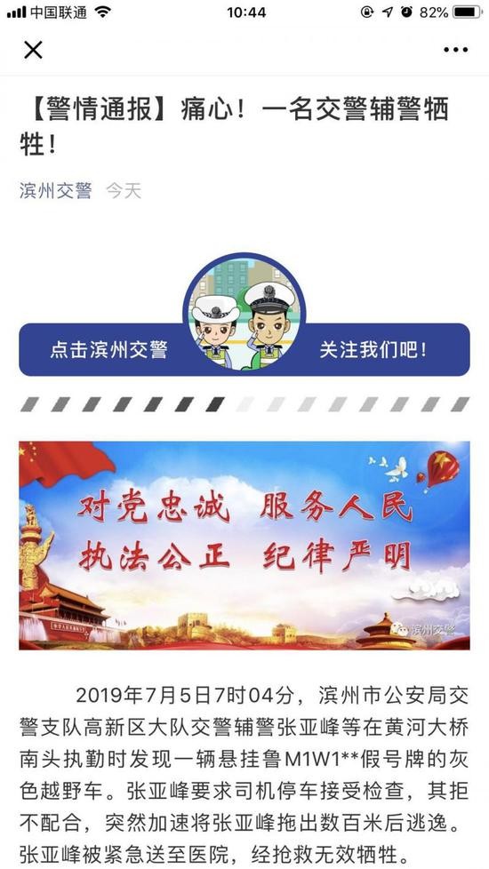 通报称,2019年7月5日7时04分,滨州市公安局交警支队高新区大队交警辅警张亚峰等在黄河大桥南头执勤时发现一辆悬挂鲁M1W1**假号牌的灰色越野车。张亚峰要求司机停车接受检查,其拒不配合,突然加速将张亚峰拖出数百米后逃逸。张亚峰被紧急送至医院,经抢救无效牺牲。