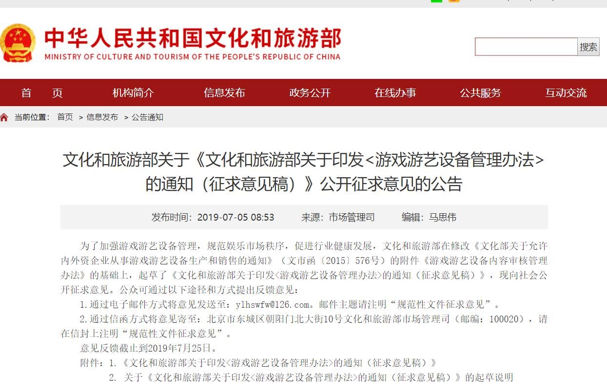 荔枝新闻讯 文化和旅游部今天(7月5日)公布《文化和旅游部关于印发<游戏游艺设备管理办法>的通知(征求意见稿)》,向社会公开征求意见,提出除国家法定节假日外,娱乐场所以及其他经营场所设置的电子游戏设备(机)不得向未成年人提供。游戏机不得含以下宣扬赌博内容:①押分、退分、退币、退钢珠等功能;②捕鱼机等以设置倍率形式以小博大;③老虎机、转盘机、跑马机等由系统自动按照概率性分配方式决定结果。