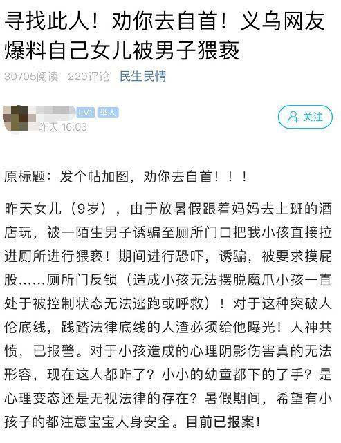 7月4日下午4:00左右,义乌稠州论坛一则消息引起大家的关注:一位自称是9岁女孩父亲的男子寻找一个人,称此人猥亵了自己的女儿。