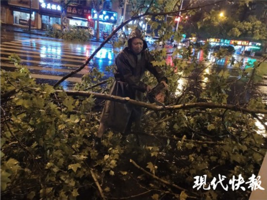 栖霞区城管局市政所抢险人员遇到险情第一时间处理,截至晚上8点多,共抢险倒伏树木4株,清理断枝16处约56根。