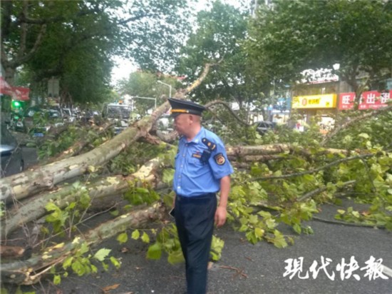 据了解,在狂风暴雨中,鼓楼区凤凰西街163号路边一行道树被大风刮断,这棵树直径约40~50公分。为了不影响交通,鼓楼区城管行政执法大队凤凰中队执法人员立即启动应急预案,对这些树木进行清理并及时联系绿化及交警部门。