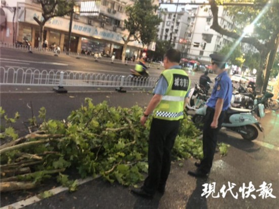 7月6日傍晚,南京狂风暴雨,多处地方出现了树木倒伏。南京市城管部门人员及时处理现场,并联系绿化部门来清理。