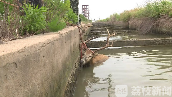 下午三点半,记者跟随麋鹿保护区救助队赶到现场,发现麋鹿在水渠里挣扎,凭借自身的力量无法走出水渠。该水渠高约2米,水位半米深。由于渠壁笔直光滑,麋鹿无法自行爬上岸,随时有生命危险。