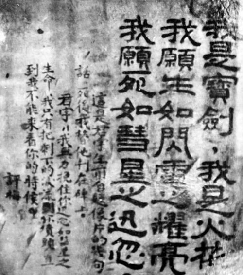 石评梅手写碑文:“‘我是宝剑,我是火花,我愿生如闪电之耀亮,我愿死如彗星之迅忽。’这是君宇生前自题相片的几句话,死后我替他刊在碑上。君宇!我无力挽住你迅忽如彗星之生命,我只有把剩下的泪流到你坟头,直到我不能来看你的时候。”每个周末石评梅都会风雨无阻前来祭吊,因悲伤过度,三年后她也病逝。后来石评梅被安葬在高君宇墓旁,实现了她“生前未能相依共处,愿死后得并葬荒丘”的心愿。