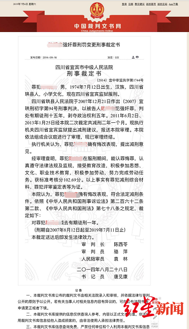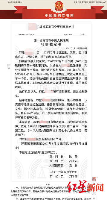红星新闻记者通过中国裁判文书网查询发现,陈某奎在本轮强奸罪入狱服刑中,先后四次获得减刑。前两次分别于2011年6月2日、2013年1月25日,经宜宾中级人民法院裁定,共减刑二年一个月。