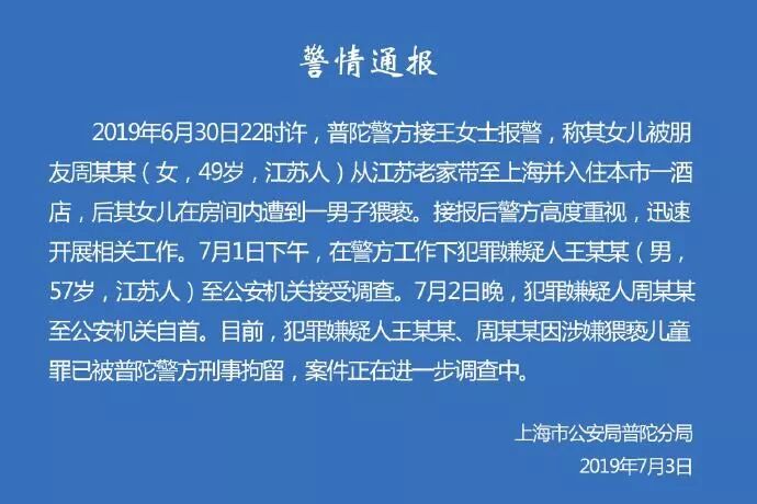7月3日晚,上海市公安局普陀分局官方微博通报,6月30日,警方接王女士报警,称其女儿被朋友周某某从江苏老家带至上海并入住本市一酒店,后其女儿在房间内遭到一男子猥亵。