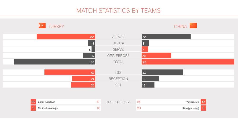本场比赛,中国队扣球50-60落后,拦网双方8-8战平,中国队发球7-4占先,中国队失误送分12分,而土耳其失误送分高达30分。
