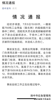 经初步调查,7月5日15:00许,一艘装载750吨工业用盐(氯化钠)的船舶航行至扬中二桥时,因舵机失灵右舷尾部触碰桥墩水下承台后破损进水,于扬中二桥下游约500米处航道外侧约100米沉没,船上2名船员被同行船舶救起,未造成人员伤亡。