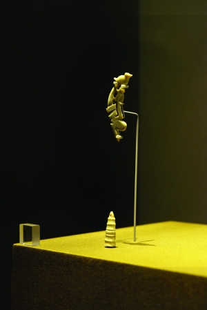 不远处,透雕人鸟兽玉饰件吸引了很多人。这件国宝出土于苏州赵陵山,表现的是一个戴着羽毛冠的人,羽冠上落着一只鸟,他的手上托着一只向上攀爬的小兽。专家推测,这个形象代表着天、地、人和谐相处,而这件饰件原本被绑缚在一个短木柄上,很可能像权杖一样,代表着某种权力。