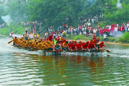到竞赛之日,参赛龙舟纷纷齐集指定河段,自选对手竞渡。比赛有双赛、数条船同赛。