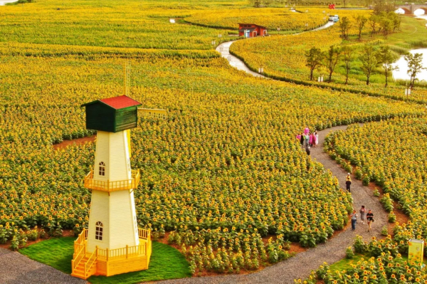 “向日葵的故事”面积2平方公里,其中1平方公里为多彩葵花景观区、1平方公里为缤纷生态景观区。景区东片区葵花花海,与大湖风光相映成趣,营造纯粹、震撼的葵花单品景观效果;西片区由芝樱、绣球、月季、玫瑰等四季花卉组成,营造春有百花秋有月、夏有凉风冬有雪的美丽景象。景区包含14个葵花品种、1500亩葵花花海、500多万株多彩葵花、6公里最美环线、600亩纯净内湖、440亩生态停车场,园内还设有3处渡口、8大风情驿站和11个景交站点。游玩过程中,您可以根据喜好或需要,在沿线的任一景交站点上下车。