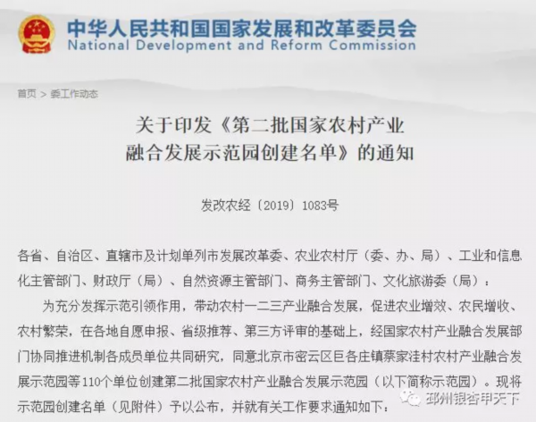 《第二批国家农村产业融合发展示范园创建名单》由国家发改委、农业农村部、工业和信息化部、财政部、自然资源部、商务部、文化和旅游部7部委联合发布,全国共计110个区县列入创建名单。2020年国家将择优从全国110个区县当中认定100个作为示范园。