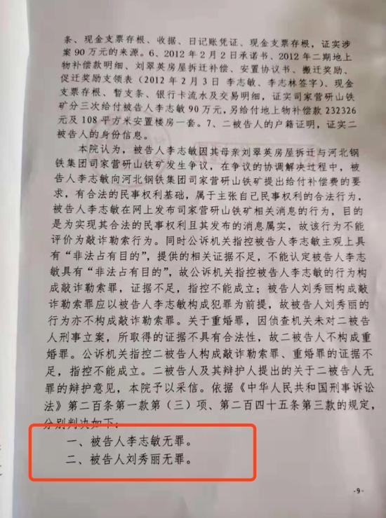 新京报记者从两名被告人的辩护人处获得的判决书显示,经迁安市法院审理,认为被告人李志敏因其母亲房屋拆迁,与河北钢铁集团司家营村研山铁矿发生争议,在争议的协调解决过程中,被告人李志敏向该矿提出给付补偿费的要求,有合法的民事权利基础,属于主张自己民事权利的合法行为。