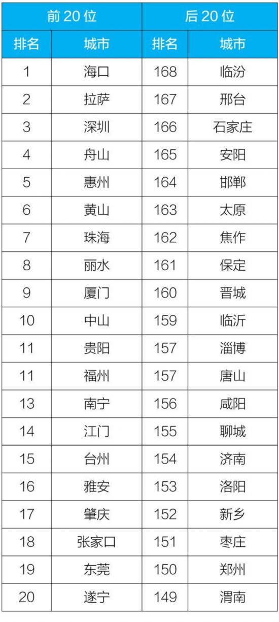 2019年6月, 168个重点城市中唐山、邢台、石家庄市等20个城市空气质量相对较差(从第168名到第149名);海口、珠海、中山市等20个城市空气质量相对较好(从第1名到第20名,见附表1)。