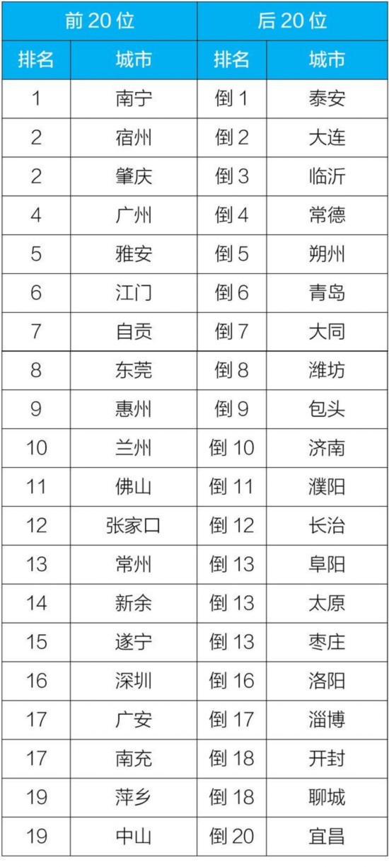 从空气质量同比改善程度看, 2019年1-6月,168个重点城市中南宁、宿州、肇庆市等20个城市空气质量改善幅度相对较好(从第1名到并列第19名);泰安、大连、临沂市等20个城市空气质量改善幅度相对较差(从倒数第1名到倒数第20名,见附表3)。