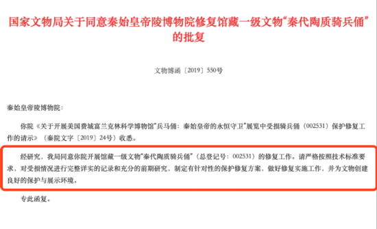 国家文物局同意了秦始皇帝陵博物院开展馆藏一级文物“秦代陶质骑兵俑”的修复工作,并要求“相关单位对受损情况进行完整详实的记录和充分的前期研究,制定有针对性的保护修复方案,做好修复实施工作,并为文物创建良好的保护与展示环境”。