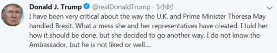 英国驻美国大使贬损特朗普的秘电6日被英媒曝光,其中不乏“不胜任”、“无能”等犀利言辞。特朗普作何反应呢?不止7日在媒体面前回应此事,他8日甚至发推怒斥,美国将不再同达罗克打交道,同时批评英国首相特雷莎·梅政府把脱欧搞得一团糟。