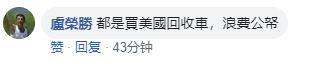 还有岛内网友表示,“都是买美国回收车,浪费公帑”,斥责蔡当局“花钱花钱再花钱”。