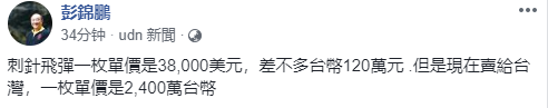 有岛内网友算了一笔账,表示:“刺针飞弹(台译)一枚单价是3.8万美元,差不多台币120万元,但是现在卖给台湾,一枚单价是2400万台币”。