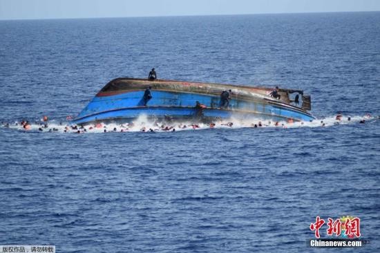 资料图:当地时间2016年5月25日,利比亚近海海域,一艘满载难民的船只即将倾覆,船上的难民纷纷跳海逃生。