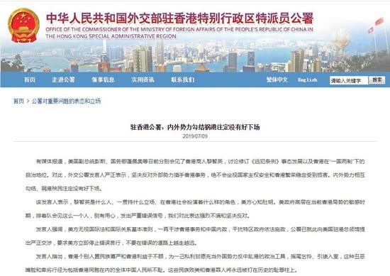 2019年7月9日,有媒体报道,美国副总统彭斯、国务卿蓬佩奥等日前分别会见了香港商人黎智英,讨论修订《逃犯条例》事态发展以及香港在“一国两制”下的自治地位。对此,外交公署发言人严正表示,坚决反对外部势力插手香港事务,绝不会坐视国家主权安全和香港繁荣稳定受到损害。内外势力相互勾结、祸港殃民注定没有好下场。