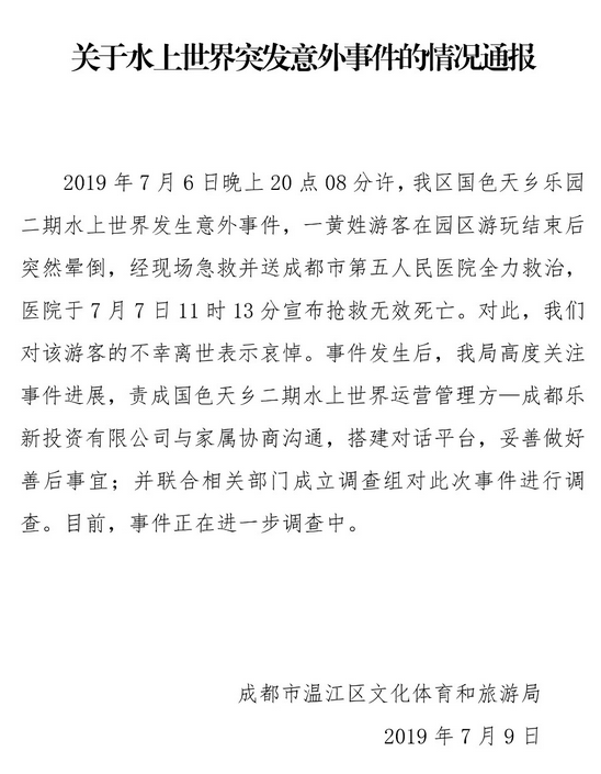 据成都市温江区旅游局消息,7月6日晚20点08分许,温江区国色天乡乐园二期水上世界发生意外事件,一黄姓游客在园区游玩结束后突然晕倒,经现场急救并送成都市第五人民医院全力救治,医院于7月7日11时13分宣布抢救无效死亡。