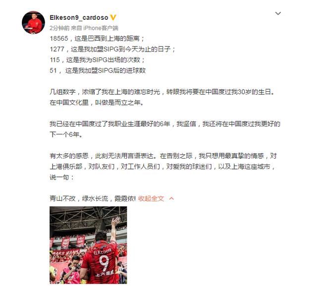 就在昨天,埃尔克森踏上了前往广州的航班,上百上港球迷自发前往机场为其送行。登上飞机后,埃尔克森在其社交网站用中文发布了一长段告别信。