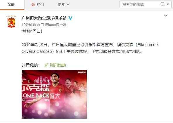 荔枝新闻讯(编辑/加戈)北京时间7月9日下午,广州恒大淘宝足球俱乐部官方宣布,埃尔克森(Elkeson de Oliveira Cardoso)9日上午通过体检,正式以转会方式回归广州队。 与此同时,上海上港也在官方微博宣布了埃尔克森离队的消息。