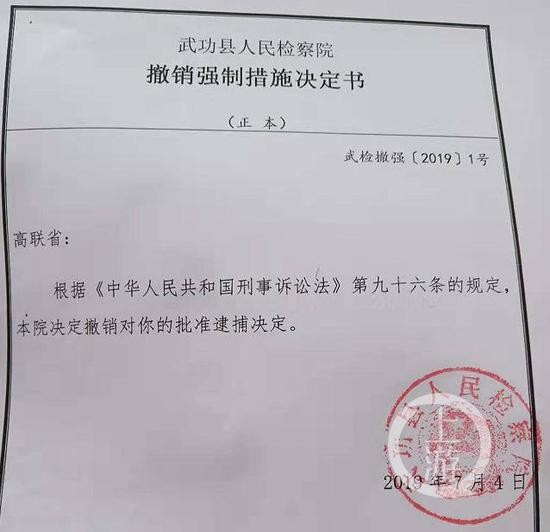 7月9日,上游新闻记者获得一份陕西省武功县人民检察院做出的《撤销强制措施决定书》显示,该《决定书》签发日期为7月4日。