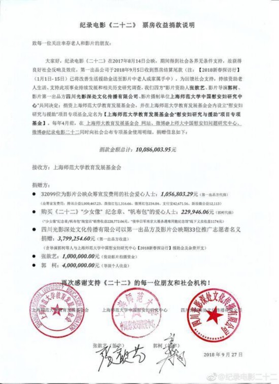 事实证明郭柯没有食言,2018年10月8日,“慰安妇”题材纪录电影《二十二》发微博进行捐款公示,影片资助人张歆艺、导演郭柯等多方共同决定向上海师范大学教育发展基金会捐资10086003.95元,这1008万的捐款中,包括郭柯捐出导演个人收益400万元和演员张歆艺借给郭柯的100万元。至此,两人都兑现了此前承诺。