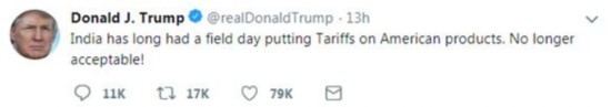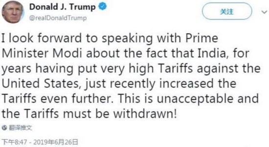 “长期以来,印度一直借机对美国产品征收关税。再也无法接受!”特朗普9日在推文中写道。