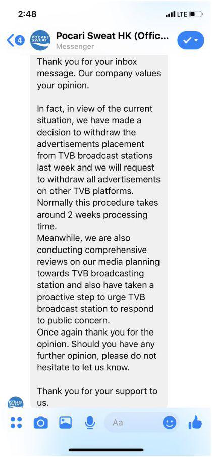 日本本部已了解发生在9日晚的这一事件,网友截图中的回应确实是香港大塚制药公司职员所为。西冈称,撤回TVB广告的决定是香港大塚制药公司经过诸多讨论,出于商业原因考虑做出,并不掺杂政治因素;此外,该决定完全由香港大塚制药公司自行作出,日本本部未给予任何指示。至于此次撤销广告为暂时性撤销还是永久性,西冈表示目前尚未做出决定,负责人员仍在进行进一步讨论。