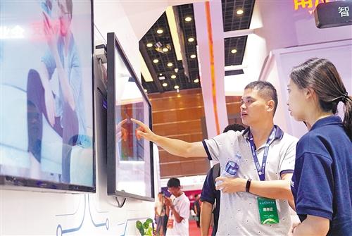 7月9日,工作人员(前左)在2019中国互联网大会展示现场介绍5G智能应用。 本报记者 赵 晶摄
